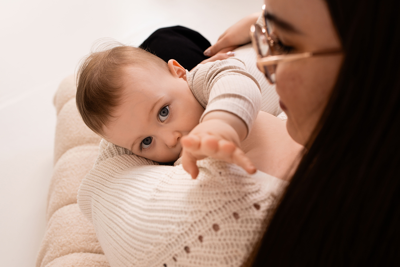 Le cadre est simple, presque minimaliste. Une pièce baignée d’une lumière douce, des drapés en lin légers, des tons neutres qui laissent toute la place aux émotions. Ici, le superflu n’a pas sa place : tout est conçu pour mettre en avant cette relation fusionnelle entre la mère et son bébé.
